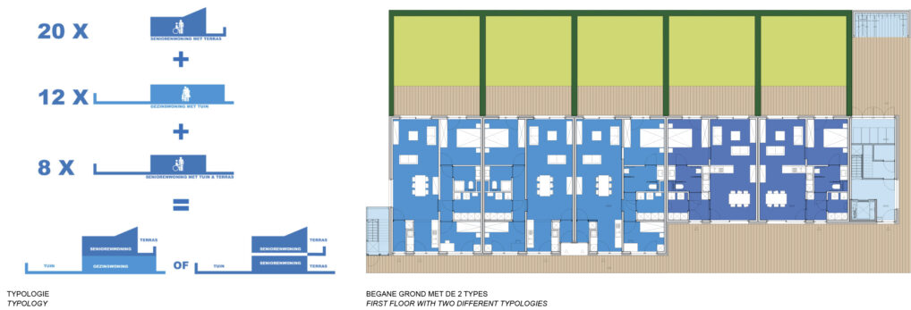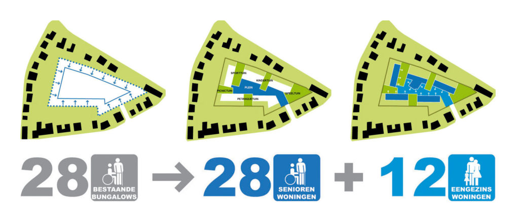 28 senior apartments in Ten Kouter are outdated. The brief defined the redevelopment of the 28 units. In our proposal we added family housing to the base program in order to create a mix of housing types and of future inhabitants. In the new situation the existing street becomes a square where the use by pedestrians is leading. With this mix Ten Kouter can develop into a truly pleasant residential area for both young and old.