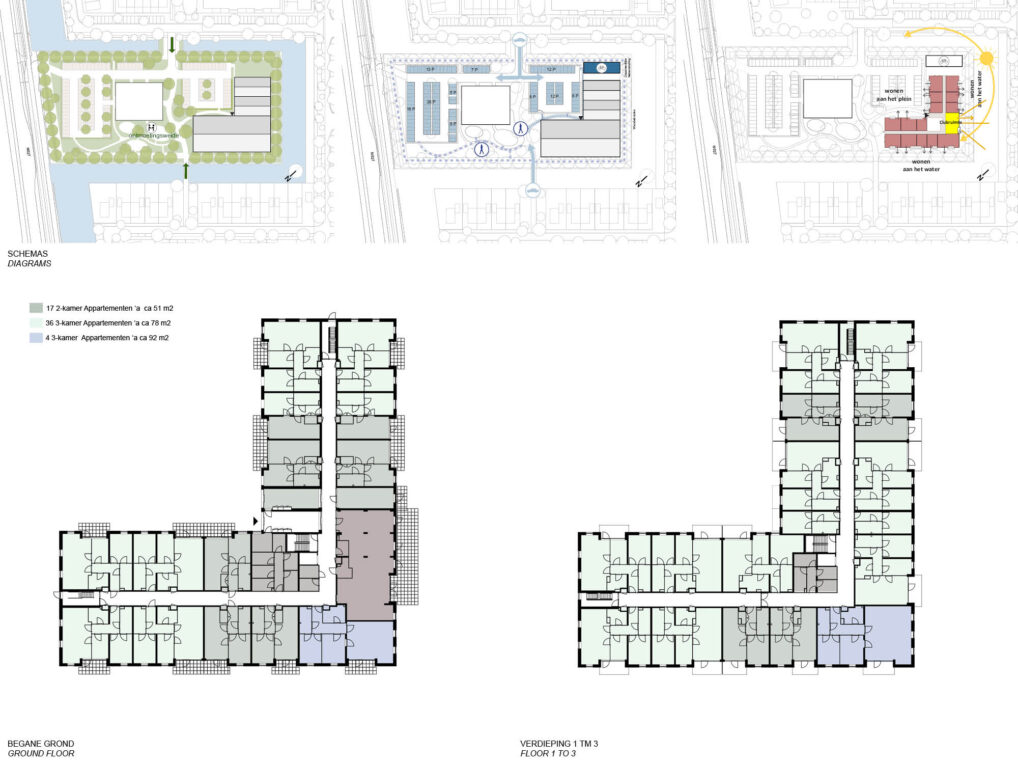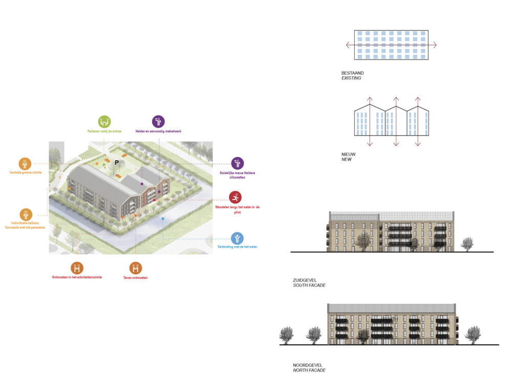 Commissioned by Volker Wessels Vastgoed, 59 life-resistant senior housing and facilities of various types have been realized in Westergouwe, Gouda. The so-called Farm Lot is part of the image quality plan WesterGouwe – II of Kuyper Compagnons. The plot is situated in the north western corner and is directly connected to the ring dike and the Provincialeweg, on the other sides it is bordered by a waterway. Two buildings are being realized on the farm plot: a care building and a residential building. Both buildings designed on all sides are emphatically oriented towards the central green space where the main entrances are located.