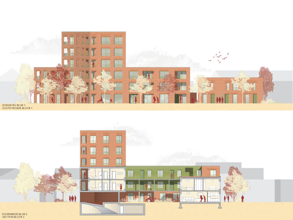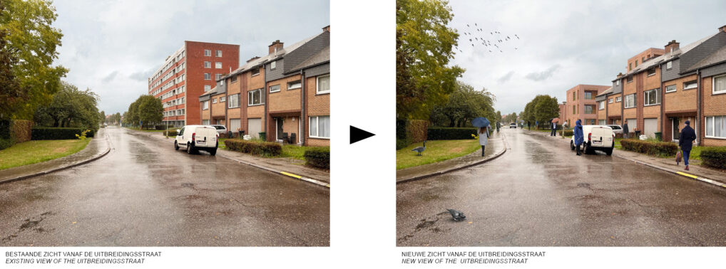 Each house in our proposal has a double orientation and has a spacious living space with a spacious terrace. Apartments on the ground floor and houses have a back garden and a front garden that forms the transition to the public domain. All terraces of the apartments overlook the new public green or have a view of the Rupel.