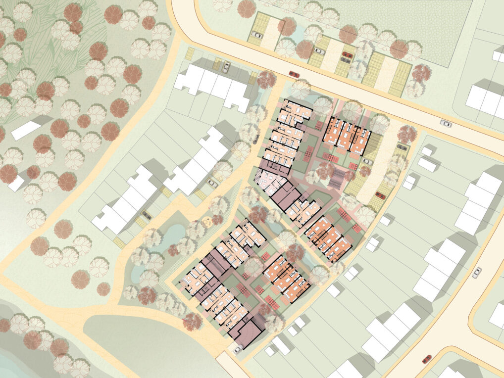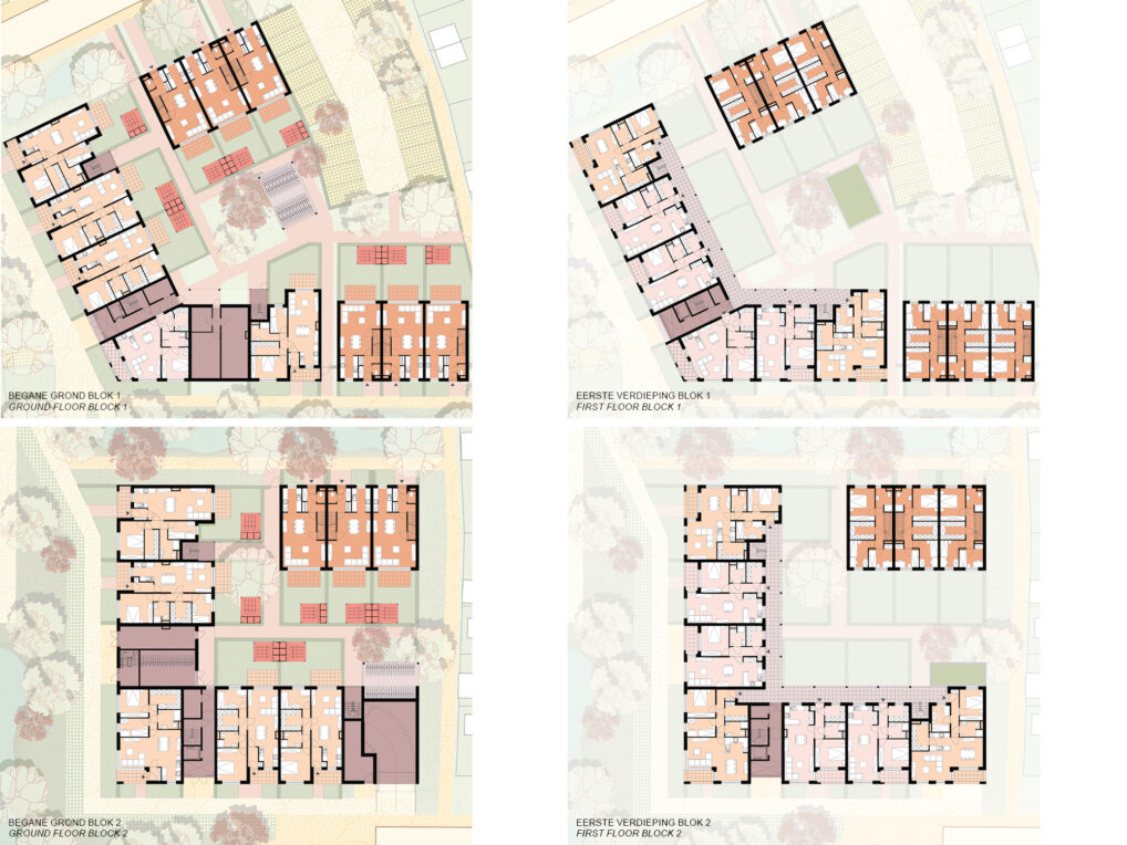 are located on the eastern side of the area, against the backyards of the neighbors. In this way, these 2-layer volumes beautifully shape the transition to the environment. The other 48 homes are apartments with 1 or 2 bedrooms.