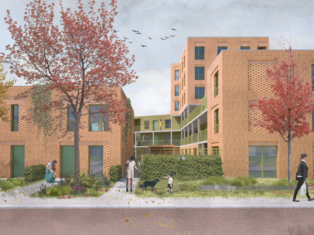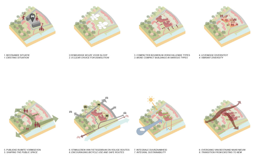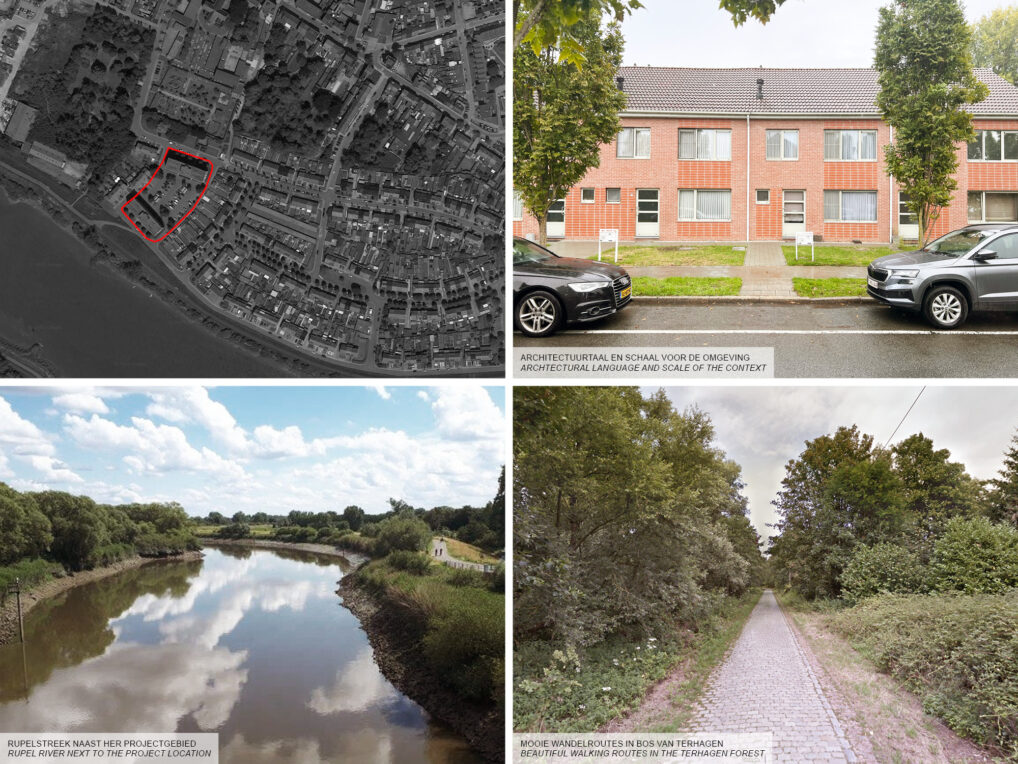 SHM Goed Wonen Rupelstreek wants to realize a contemporary housing project by replacing the existing apartments with new contemporary comfortable homes. By means of the integration of new homes, a living environment is created with its own character embedded in the environment. The new residential environment must contribute to the development of a high-quality and active public space. The position of the location between forest and Rupel is unique, it is surrounded by greenery and beautiful nature with the Rupel and Park and forest of Terhagen. The surrounding area is characterized by brickworks that historically made up a large part of the area. There are currently 2 7-storey apartment buildings in the area. The apartments no longer meet modern comfort requirements and a decision has already been made to demolish them. That is also the starting point of our proposal. The ground-level dwellings located in the study area will be retained (for the time being). In the current situation, the vast majority of the open space within the contours of the study area is used for parking, resulting in a lot of pavement and a lack of usable, high-quality public outdoor space. The redevelopment of the site will realize a major improvement in quality, both for the current residents and neighbors and for the public space.