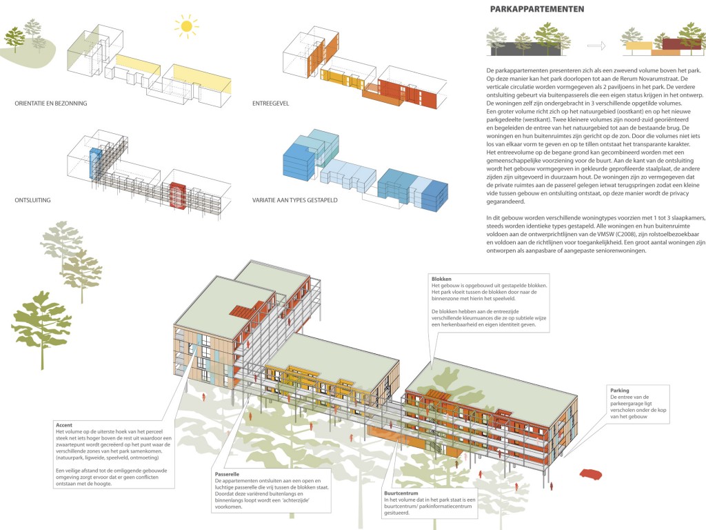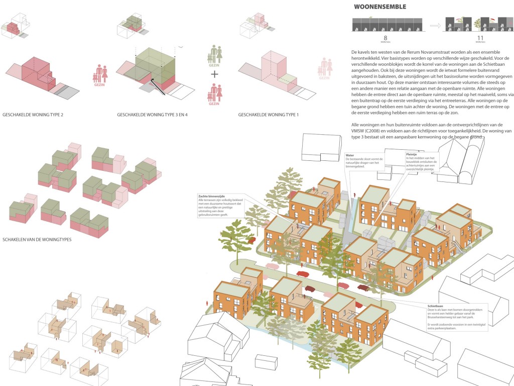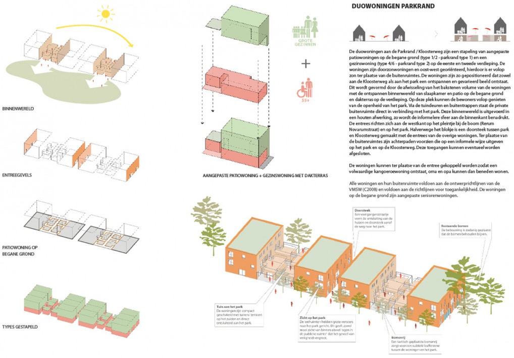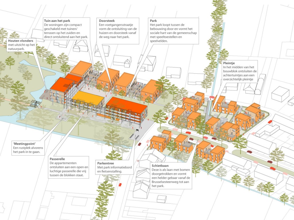 The existing houses in Den Tir do not meet nowadays housing standards anymore and will make way for new affordable housing. The existing small houses will be replaced by a wide and contemporary variety of housing typologies. In the future there will be a place for young and old people in the renewed neighborhood, small and large families will be able to find a place and a part of the housing is reserved for elderly or handicapped. The current and new dwellers can choose between a house with a (compact) garden or an apartment with a view over the park. Besides the renewal of the housing stock, the public space will be completely renewed. Streets will become squares or new green space. The relation with the adjacent park will become stronger and custom made facilities will be placed around the new neighborhood.
