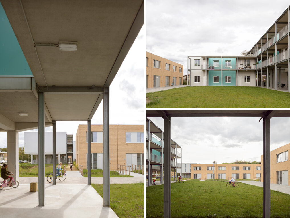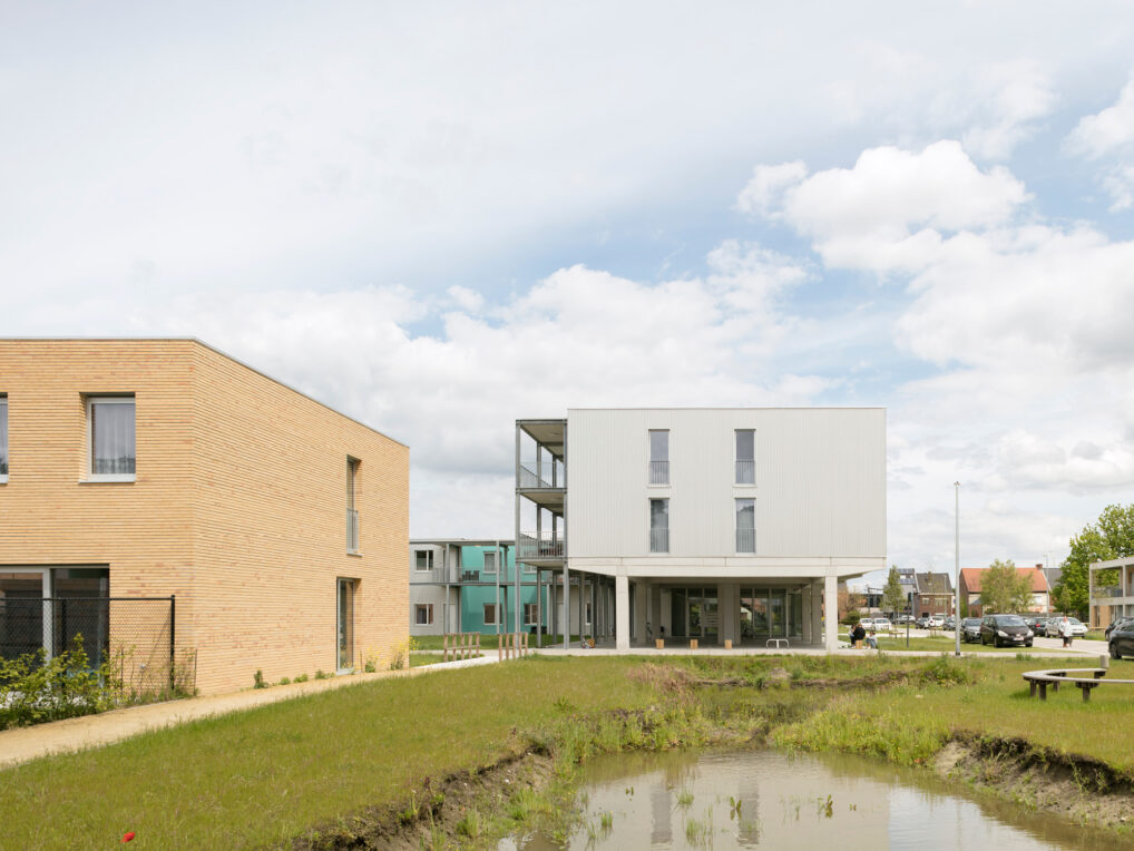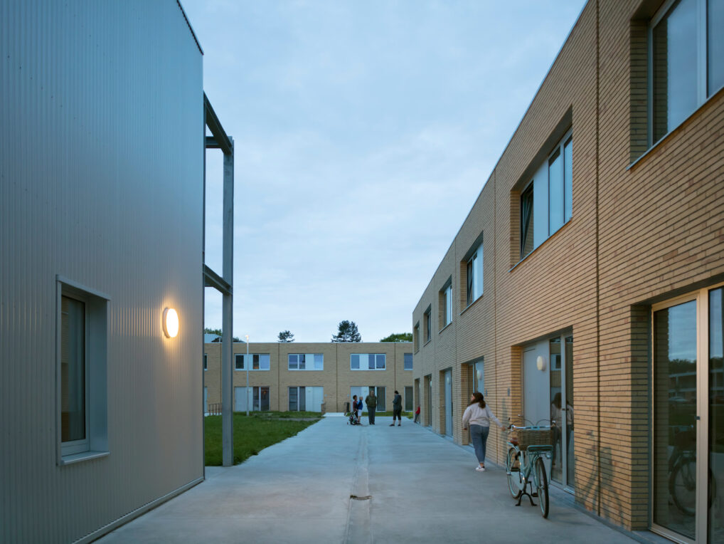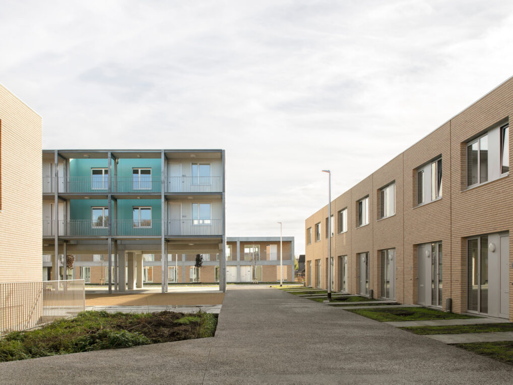 The base for the development of Ter Heidelaan is the combination of a clear and powerful new public space with compact, sustainable houses. In this new system, a hierarchy in outdoor space, provides different typologies. The new lane is the fundament for the design, a connecting element between the Liersesteenweg and the sidewalk on the east side. The roadway is asymmetrical, this creates a wide lane with green space on the sides. A space for trees, water and green. On the north side, 2 courtyards are linked to the lane. Apartments and ground-level homes are situated around the courtyards. A building with compact apartments is situated between the lane and the courtyard. To point out the relationship between the various parts (courtyard and lane), the apartment building is lifted. This creates a visual relationship between the public lane and the more intimate yard. A covered outdoor space is created where the entrance to the apartments is situated. This space is also useful as a meeting point. There is a need for new, smaller social housing in Aarschot. Around 80 affordable homes are provided, in the first and second phase. These houses are designed in different typologies and this will lead to a diverse neighbourhood. A neighbourhood with a lot of attention for outside space and the relationship between interior and exterior.