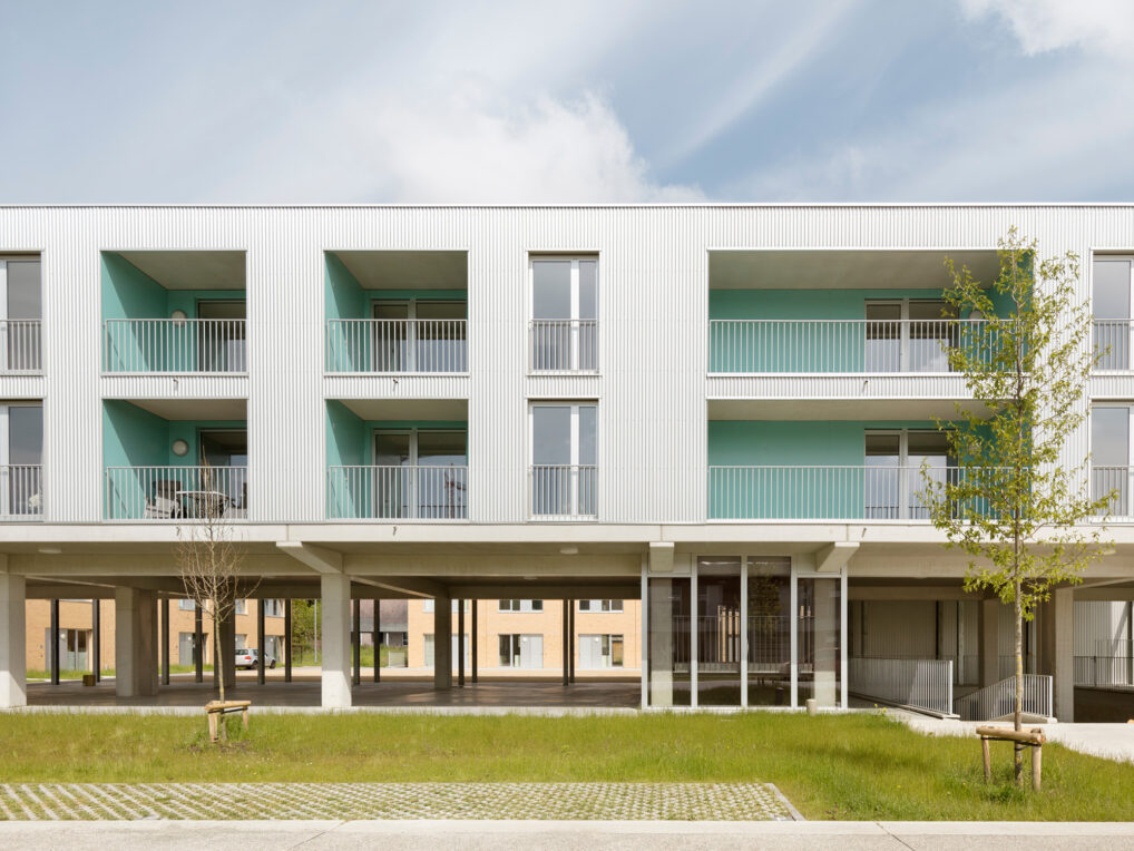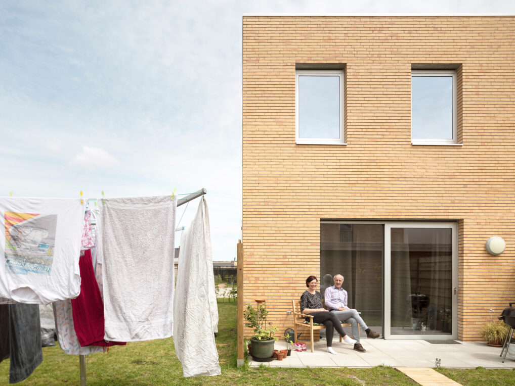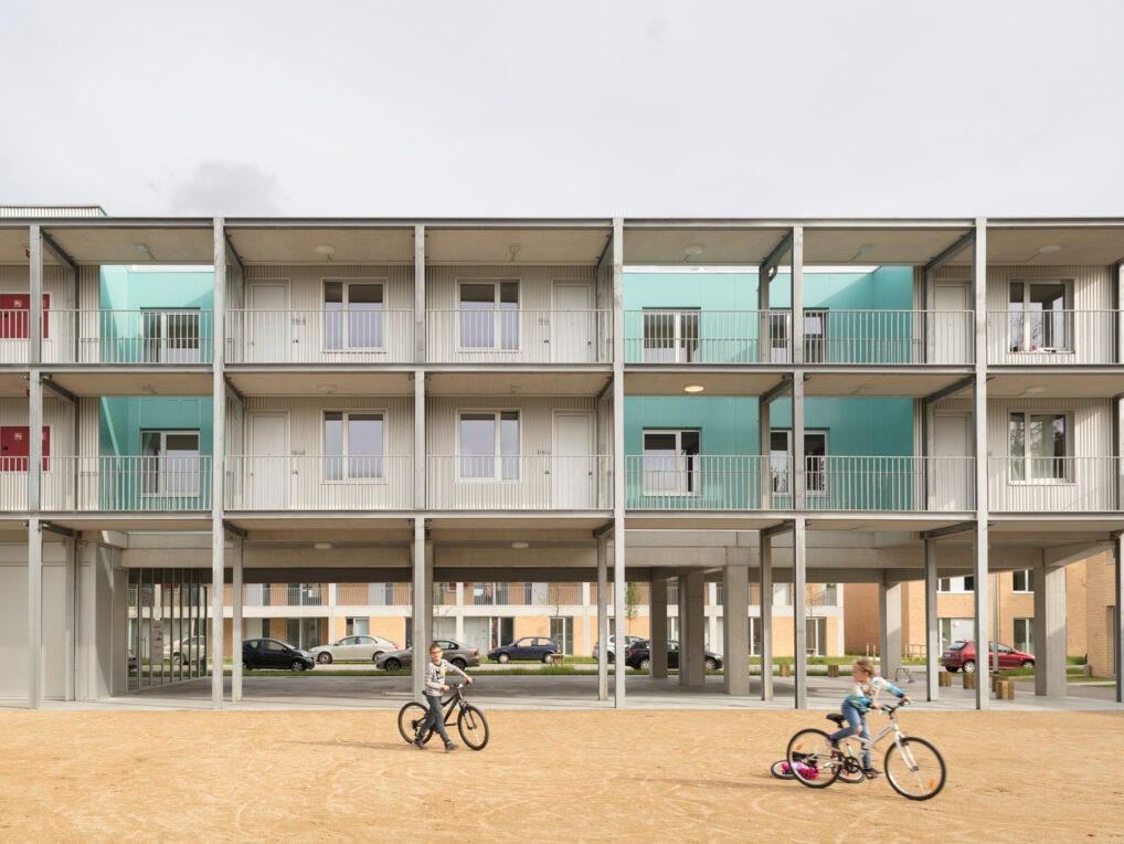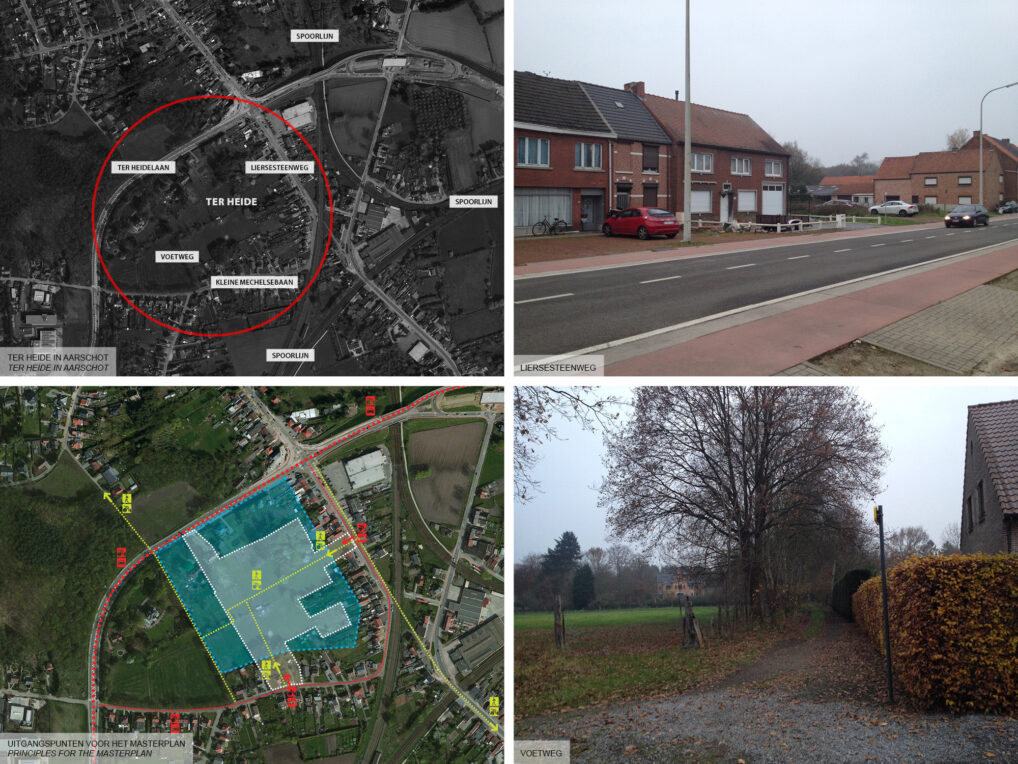 The base for the development of Ter Heidelaan is the combination of a clear and powerful new public space with compact, sustainable houses. In this new system, a hierarchy in outdoor space, provides different typologies. The new lane is the fundament for the design, a connecting element between the Liersesteenweg and the sidewalk on the east side. The roadway is asymmetrical, this creates a wide lane with green space on the sides. A space for trees, water and green. On the north side, 2 courtyards are linked to the lane. Apartments and ground-level homes are situated around the courtyards. A building with compact apartments is situated between the lane and the courtyard. To point out the relationship between the various parts (courtyard and lane), the apartment building is lifted. This creates a visual relationship between the public lane and the more intimate yard. A covered outdoor space is created where the entrance to the apartments is situated. This space is also useful as a meeting point. There is a need for new, smaller social housing in Aarschot. Around 80 affordable homes are provided, in the first and second phase. These houses are designed in different typologies and this will lead to a diverse neighbourhood. A neighbourhood with a lot of attention for outside space and the relationship between interior and exterior.