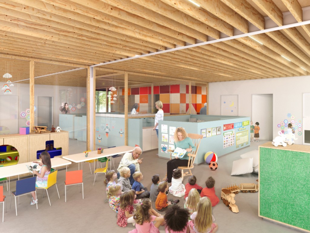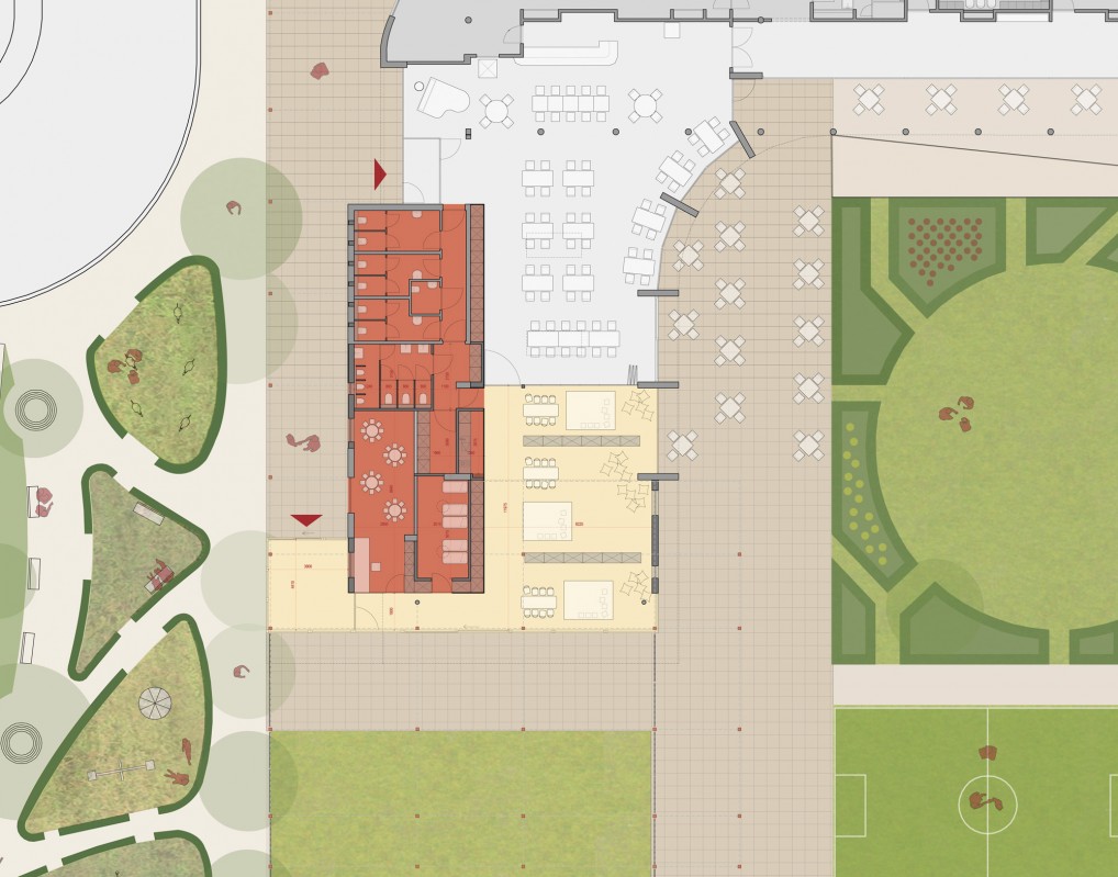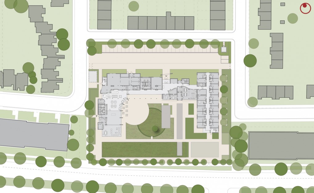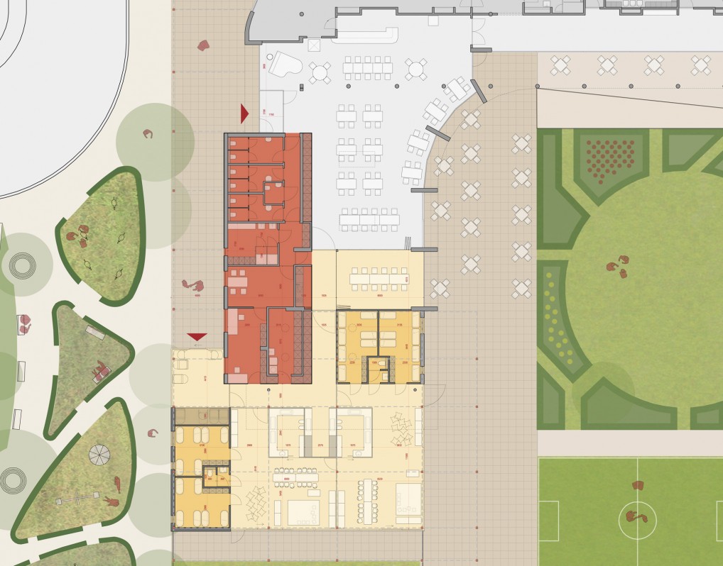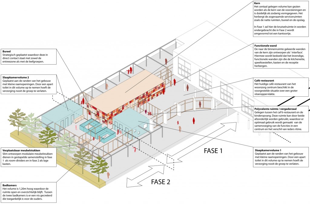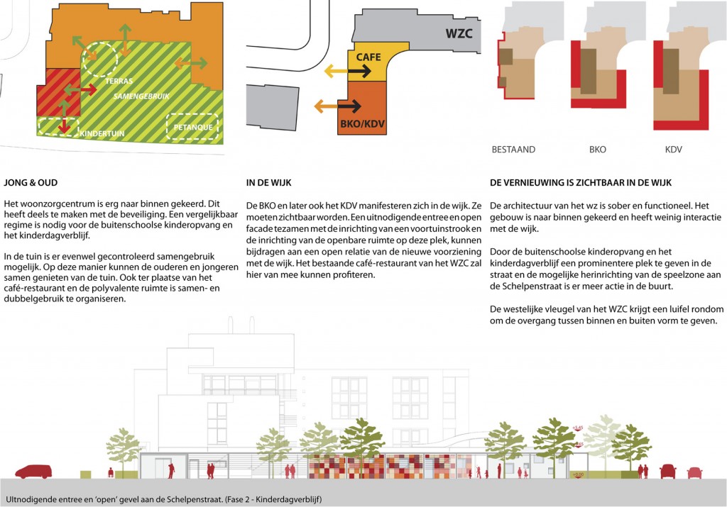Nursing home A. Lacourt will free up space in its west wing for a new daycare center. With a transformation within the existing casco phase 1 of the daycare will be realized. The second phase is planned as a new addition to the existing building. With this transformation Ostend expands its social-cultural facilities in this area and the nursing home opens up to the neighborhood. In the courtyard kids and elderly can play together.