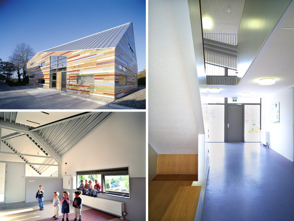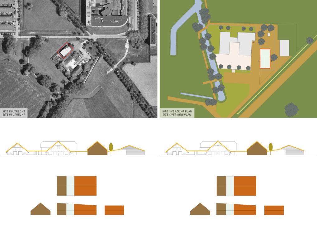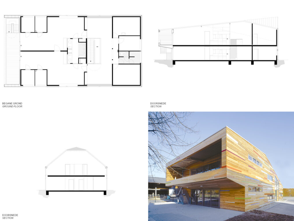 On the edge of the University site De Uithof in Utrecht is a monumental thatched farmhouse and a wooden stable. Between these two rustic buildings, a brightly colored nursery is housed in a wooden building with a surprising roof shape.