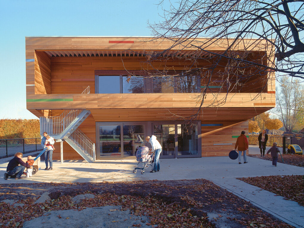 The building has a symmetrical structure and consists of two floors. This structure follows the organization of the nursery in detail. To this end, the building is divided into three clearly recognizable zones: a zone at the front with spaces for the organization, the entrance and the arcade in the middle and at the rear: the group rooms. The large covered balcony, which overlooks sheep in the meadow, forms the outdoor space for the group areas on the first floor. At the same time, it offers protection against direct sunlight from the living areas on the ground floor.
