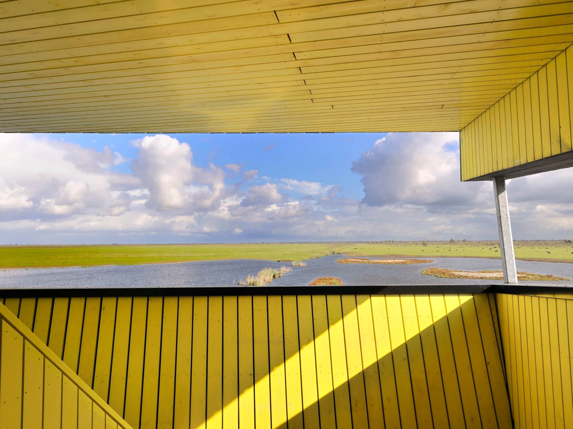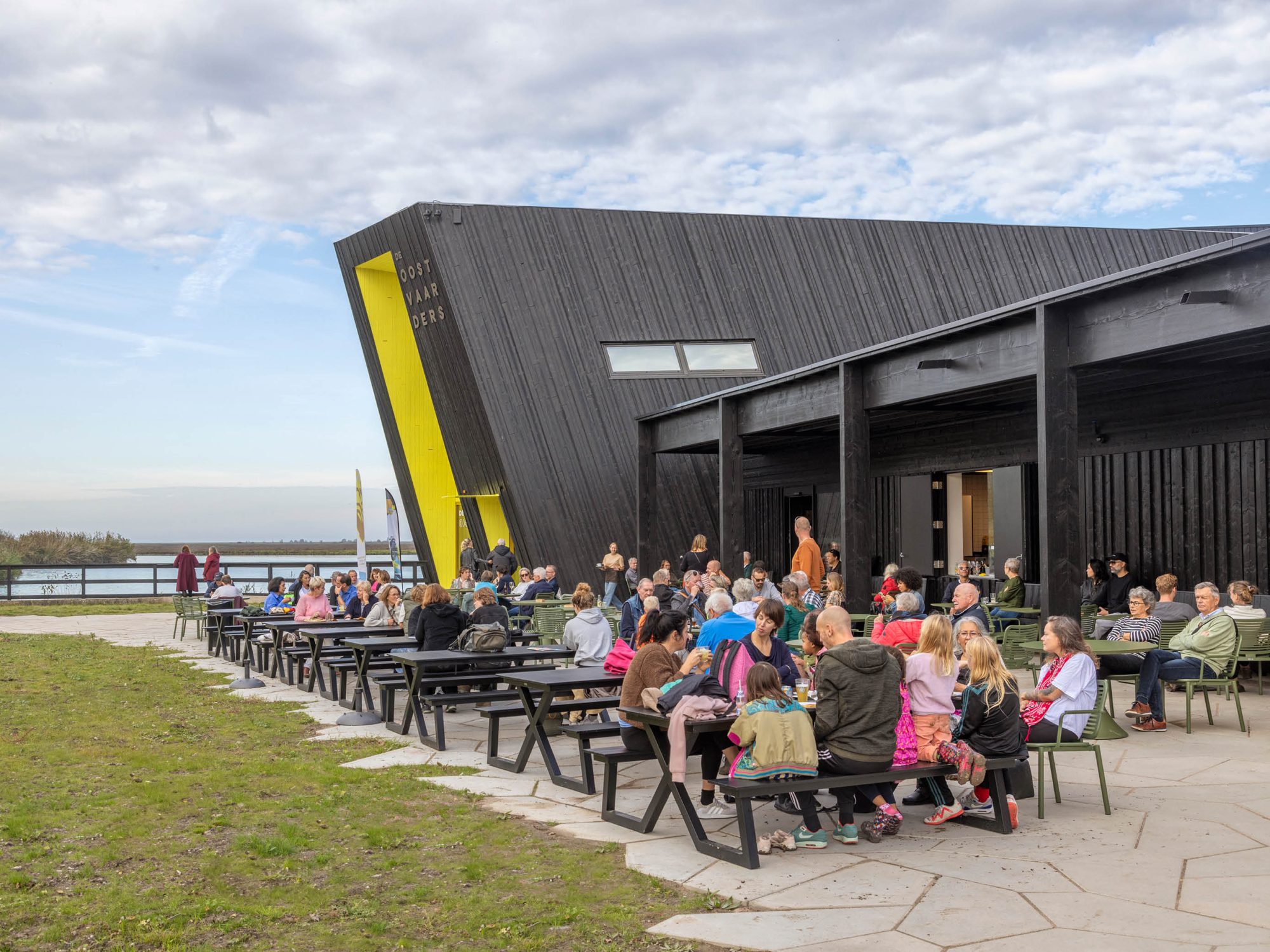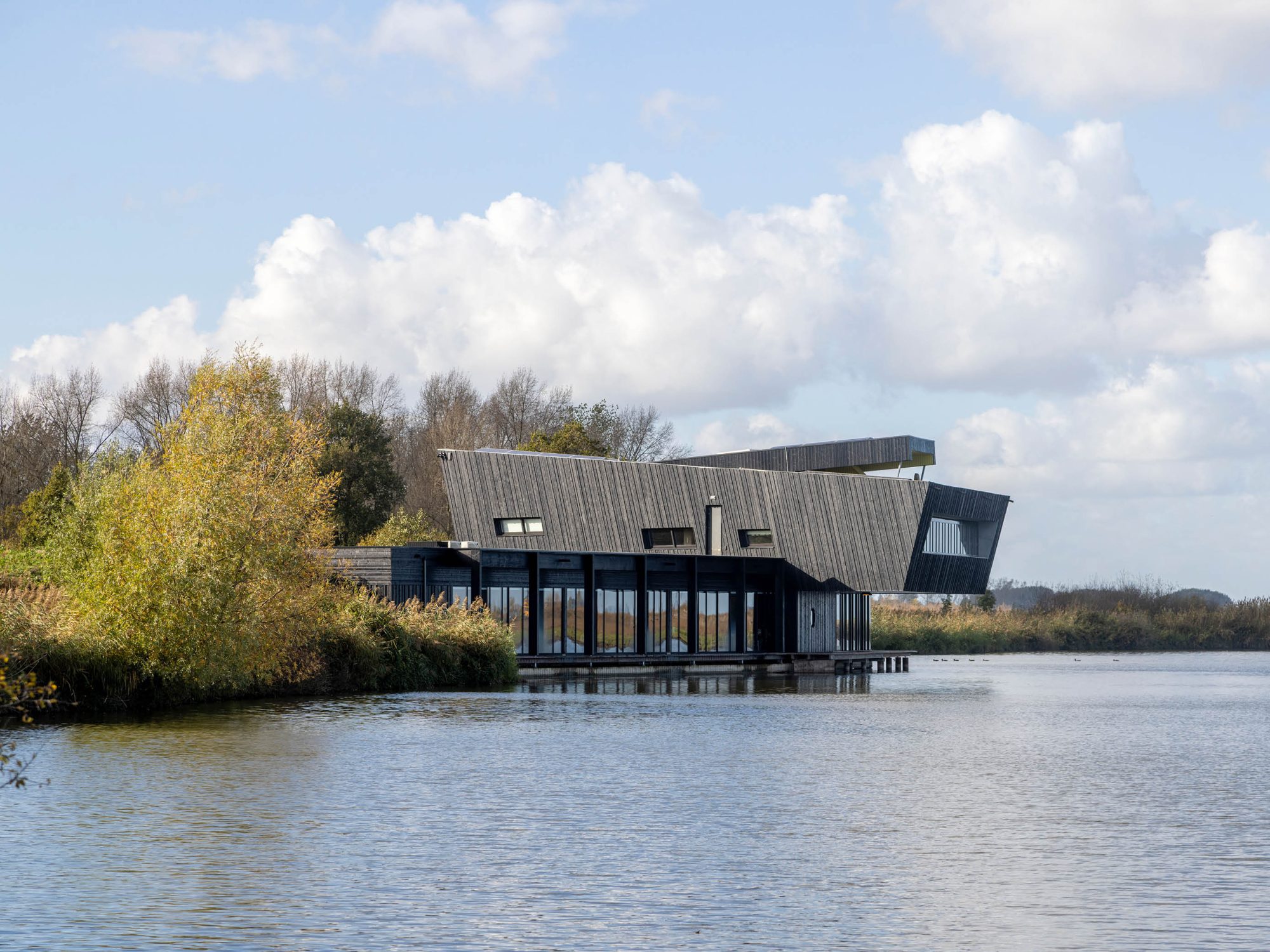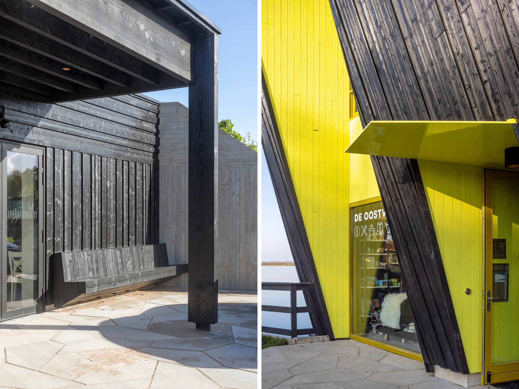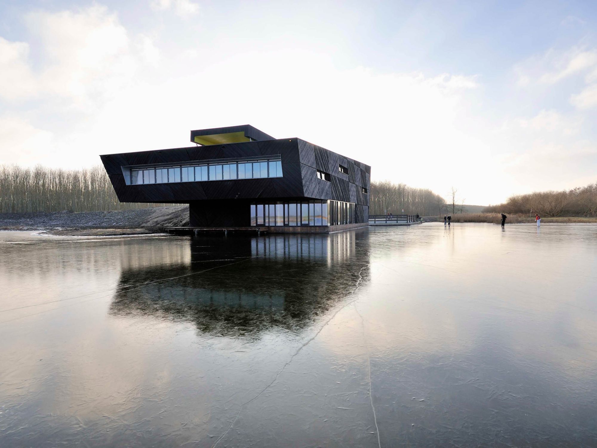 The Nature Experience Center stands at the edge of the Oostvaardersplassen in Almere, one of Europe’s most unique and internationally renowned nature reserves. Positioned where four distinct landscapes converge—water, forest, reed beds, and polder land—the building is a physical landmark and a vital link between the city and its surrounding nature. Since its completion in 2008, the original building serves as a hub for nature education and observation. With the designation of the Oostvaardersplassen as part of Nieuw Land National Park, interest in the site grew rapidly, attracting a diverse range of visitors: nature enthusiasts, hikers, cyclists, school groups, and international tourists alike. To accommodate the growing number of visitors, it has been decided to expand, renovate and redesign the center. The original building was conceived as a beacon: a compact vertical volume highlighted by bright yellow accents, underlining its role as a gateway to the Oostvaardersplassen. The expansion respectfully continuing the same architectural language and material palette—black-stained timber façades with vertical detailing—while introducing a strong horizontal gesture.