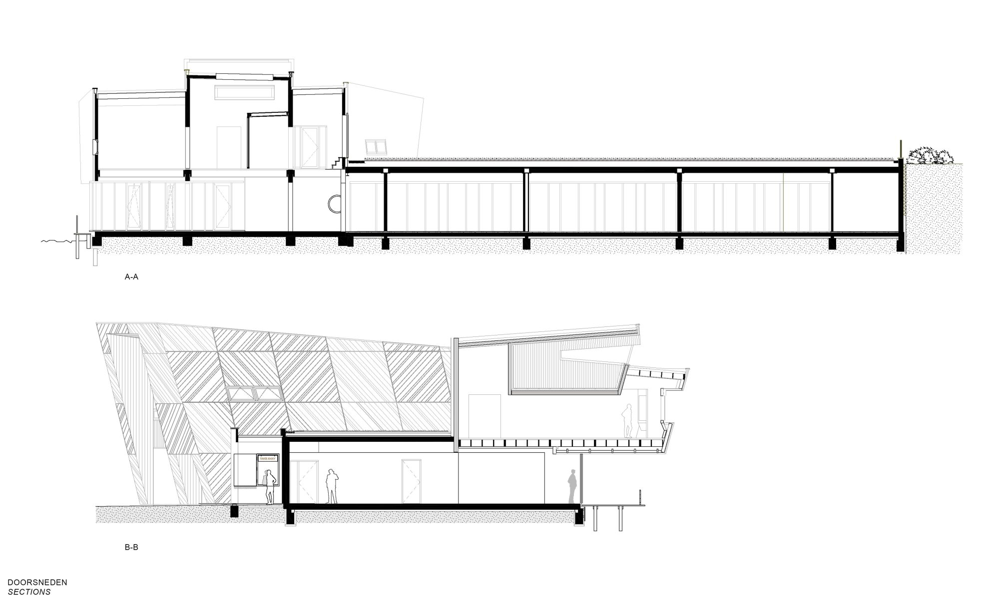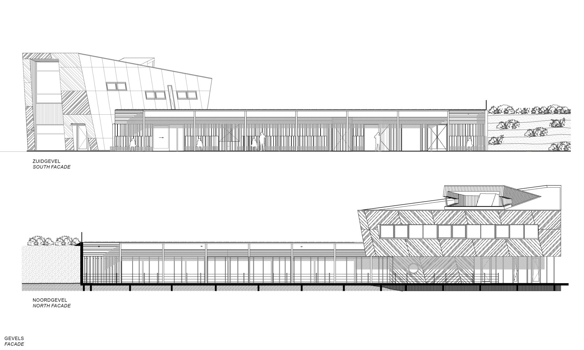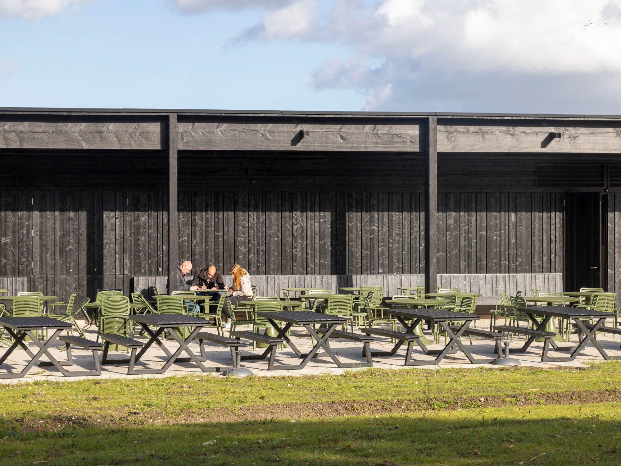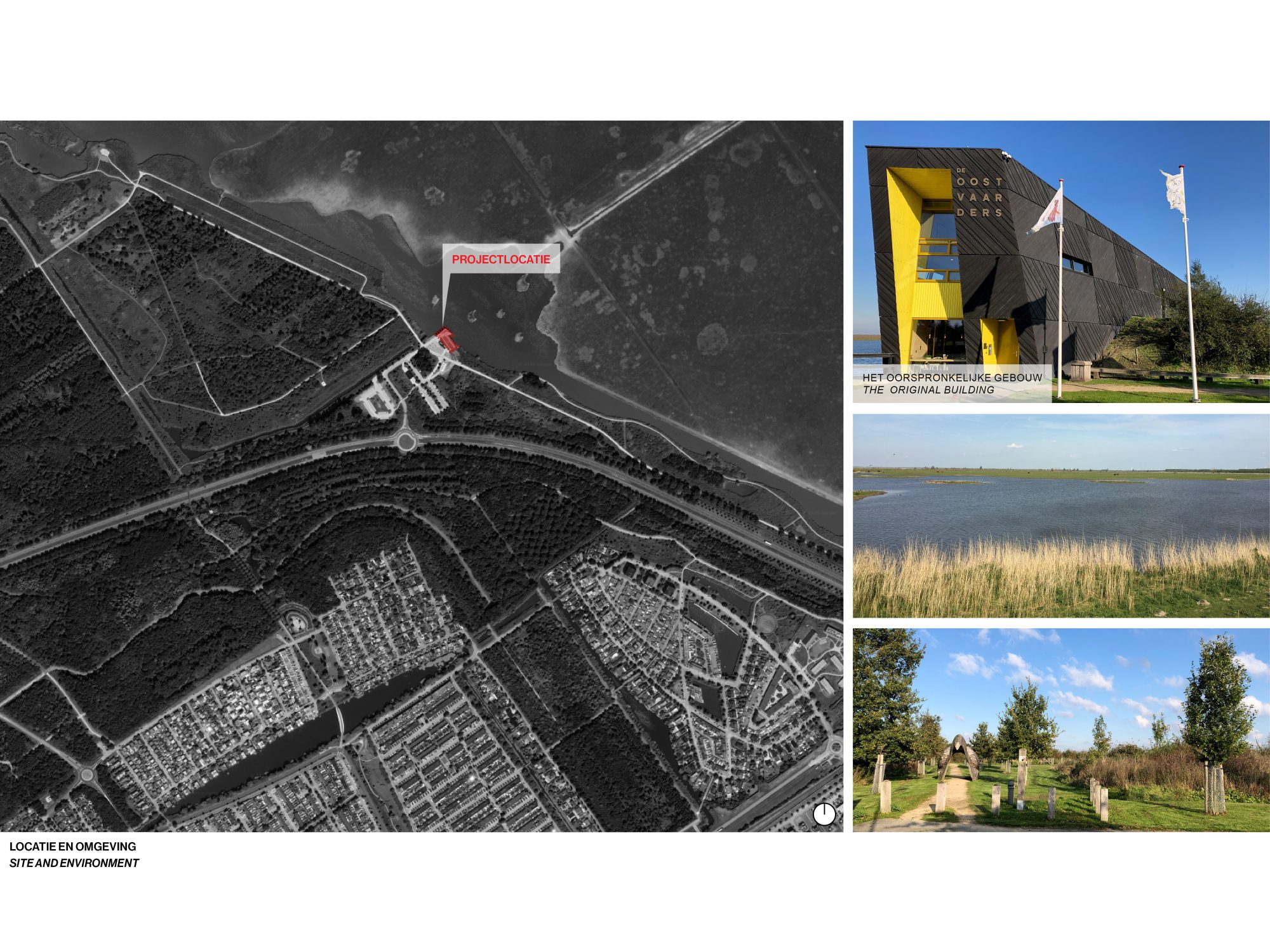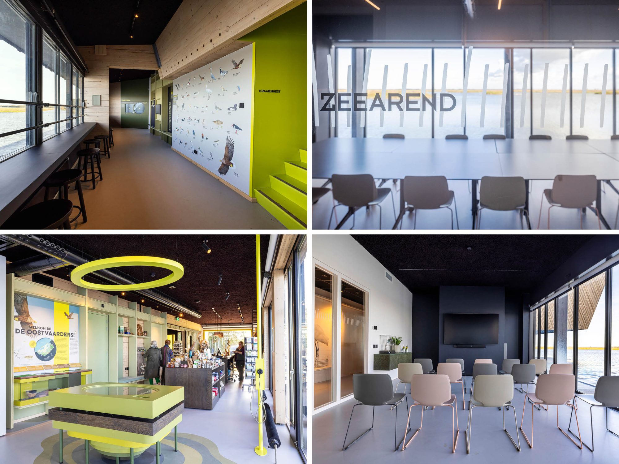 The Nature Experience Center stands at the edge of the Oostvaardersplassen in Almere, one of Europe’s most unique and internationally renowned nature reserves. Positioned where four distinct landscapes converge—water, forest, reed beds, and polder land—the building is a physical landmark and a vital link between the city and its surrounding nature. Since its completion in 2008, the original building serves as a hub for nature education and observation. With the designation of the Oostvaardersplassen as part of Nieuw Land National Park, interest in the site grew rapidly, attracting a diverse range of visitors: nature enthusiasts, hikers, cyclists, school groups, and international tourists alike. To accommodate the growing number of visitors, it has been decided to expand, renovate and redesign the center. The original building was conceived as a beacon: a compact vertical volume highlighted by bright yellow accents, underlining its role as a gateway to the Oostvaardersplassen. The expansion respectfully continuing the same architectural language and material palette—black-stained timber façades with vertical detailing—while introducing a strong horizontal gesture.