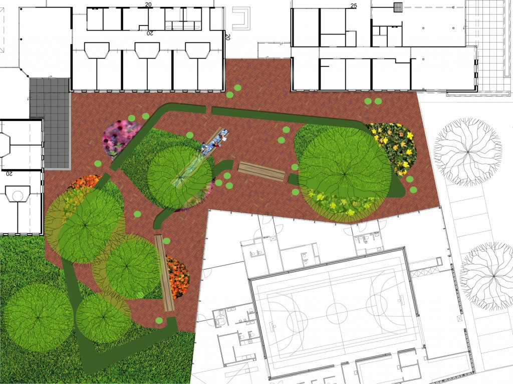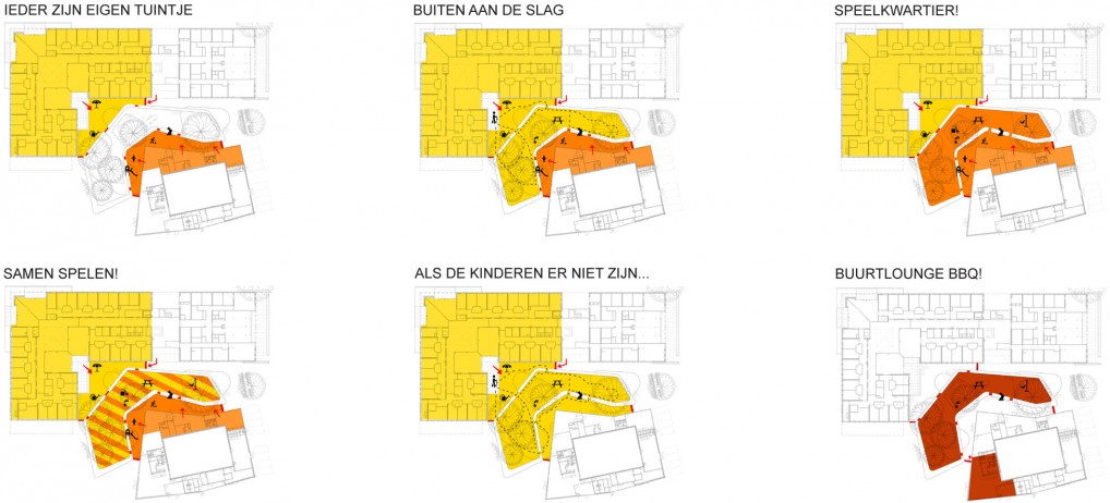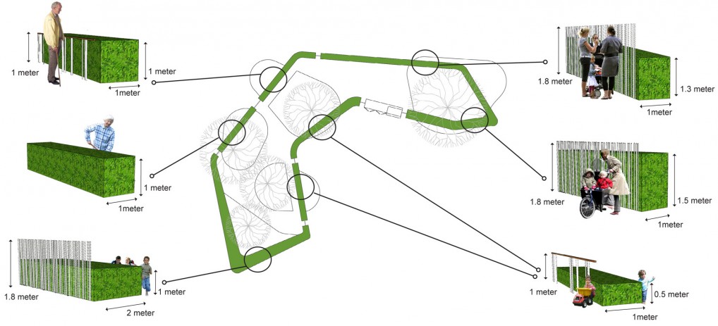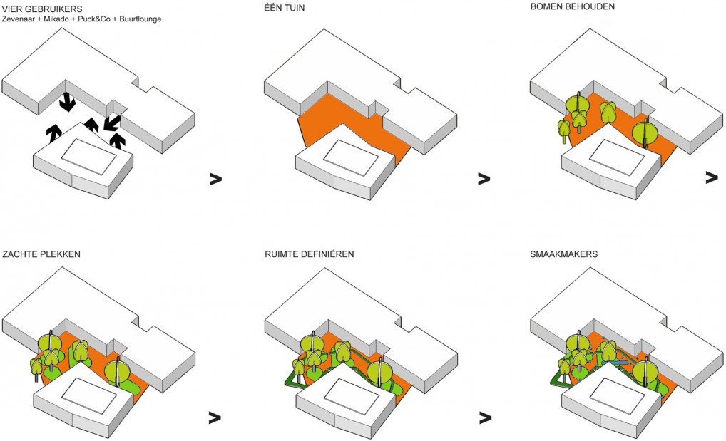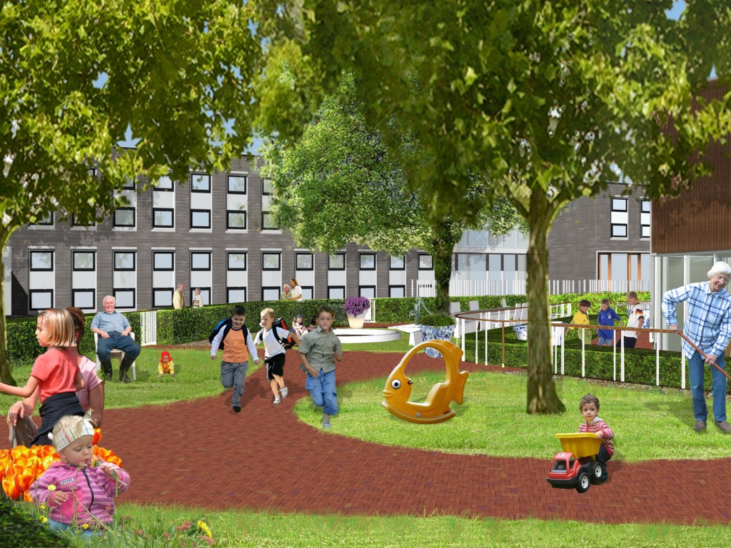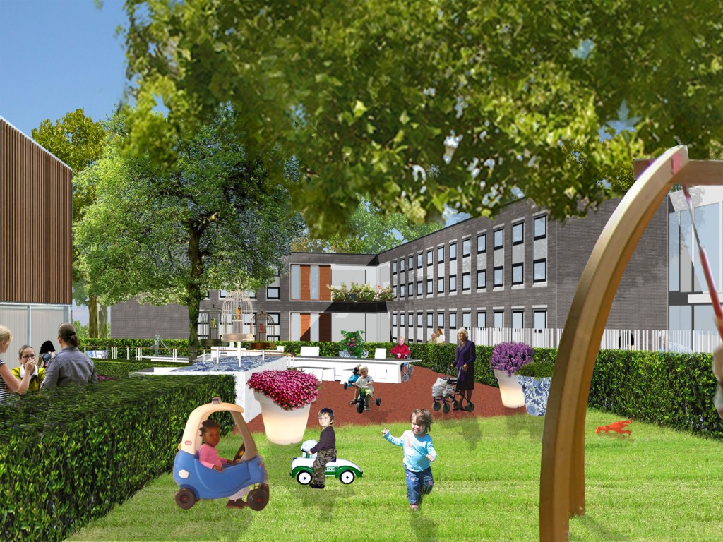 The open space between the Huis van Droo and the elderly home will be used by both the elderly and the children. On the one side, the children of the daycare center will use the space as their playground. On the other side, the elderly people will use it as their garden and terrace. Together we made a plan where individual, simultaneous and common use is made possible and stimulated. We looked for similarities between the smallest children and the elderly. Themes like circuits, safety, overview and coziness are considered in the plan.