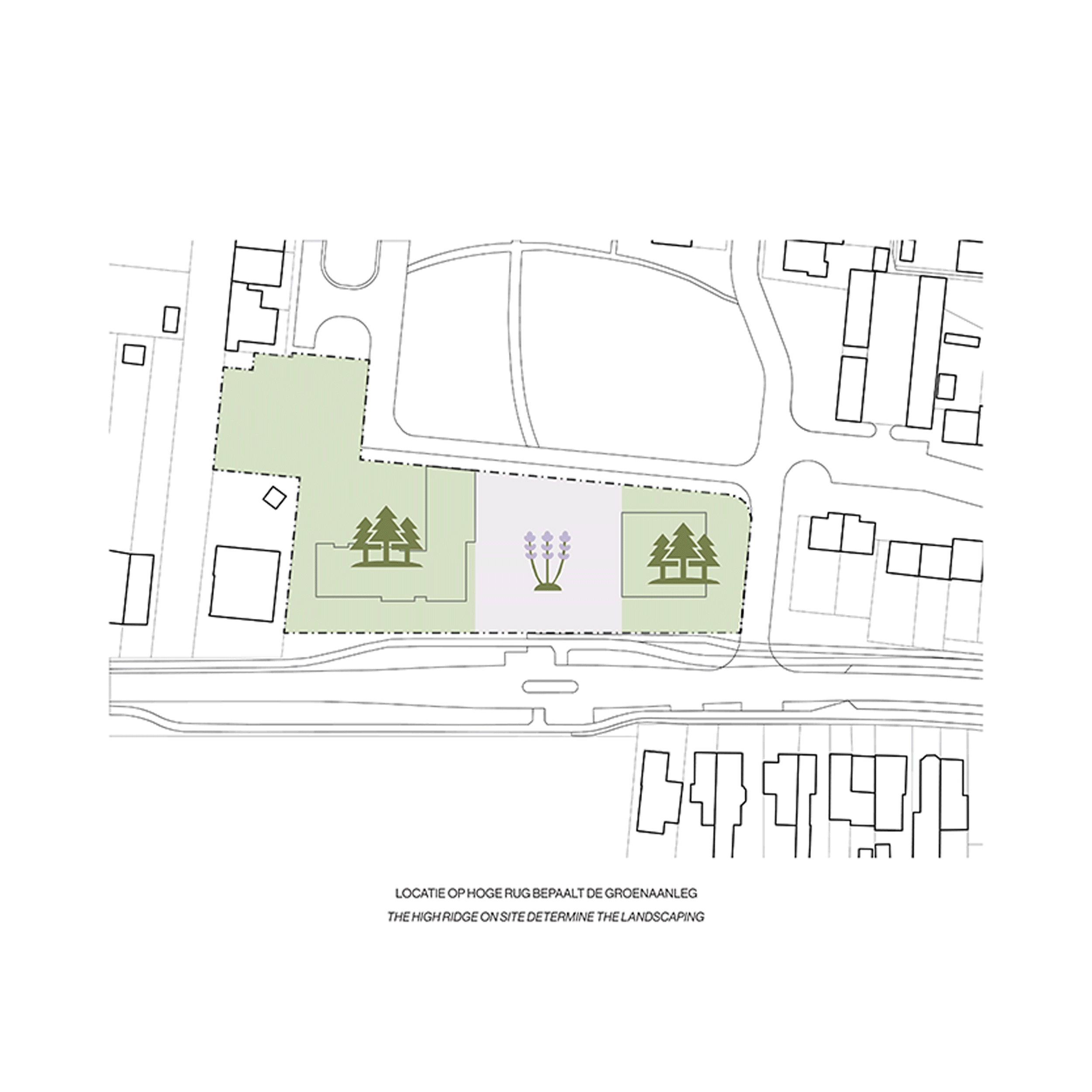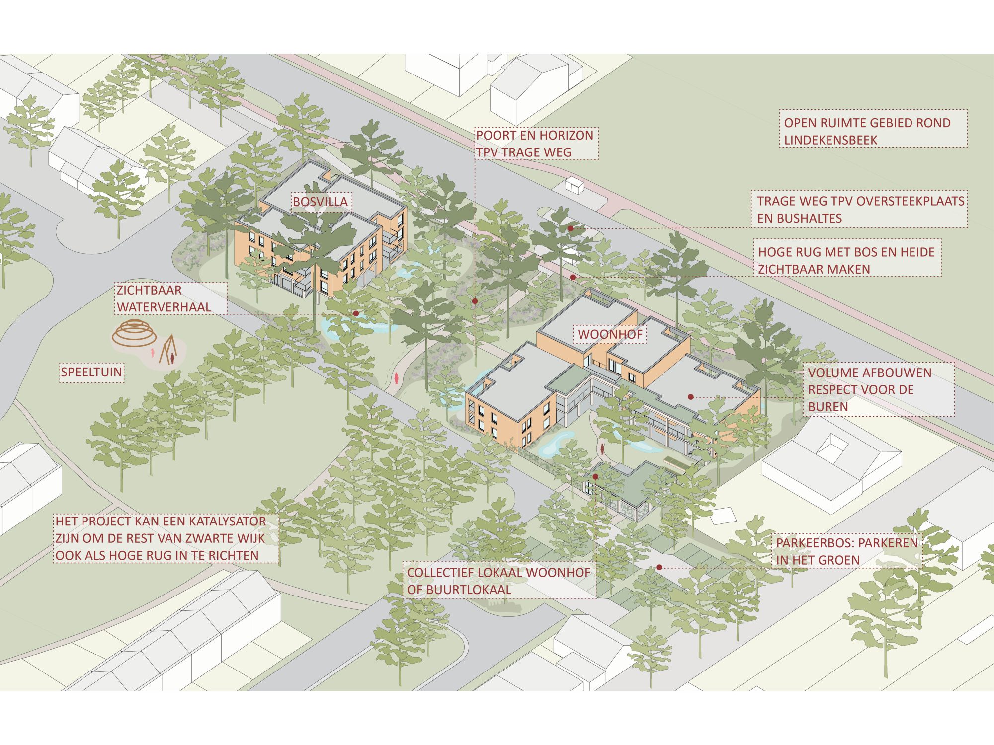 The project is located at the threshold between village and landscape, on the so-called “Hoge Rug” (High Ridge). This landscape structure forms the inspiration for the green design. The site will be largely de-paved and transformed into an ecologically valuable environment with mixed woodland, heath vegetation, and wadi systems for water infiltration. Rainwater will be entirely reused or infiltrated on site, creating a climate-resilient and future-proof living environment.