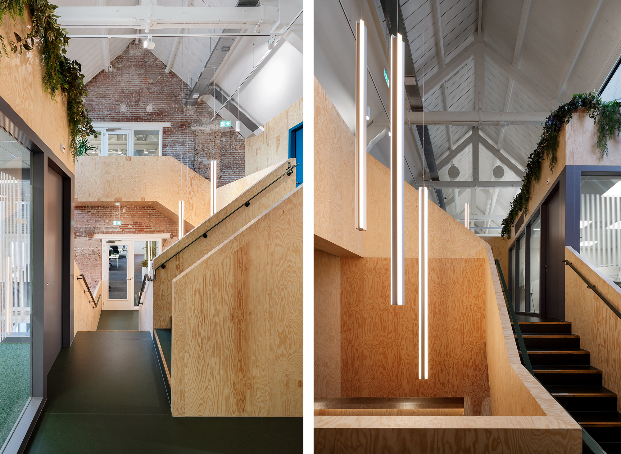 The office space for Attic is located on the attic floor of the oldest factory building on the site. As a result, the building has historical qualities, in order to realize a contemporary landscape office, the following interventions have been made. First of all, a number of walls without architectural value have been demolished. This creates a more open space with more possibilities for the design. The different floors are connected by a void, creating an office landscape of five floors. The double wooden gable roof is now visible from different floors. The office landscape is given shape by placing various pieces of furniture. Every space has its own character within this larger concept Finally, a part of the tiled roof has been replaced for glass. The new workplaces are therefore provided with light and have a view over the river Maas. A contemporary office has been created without losing the historic character of the building.