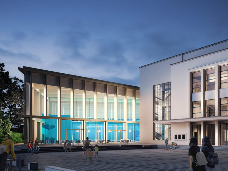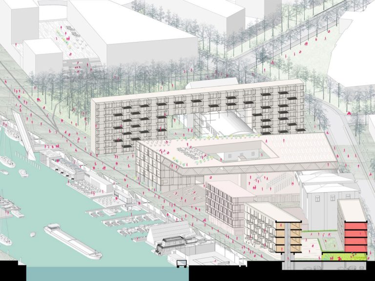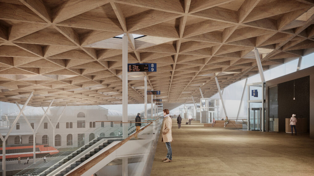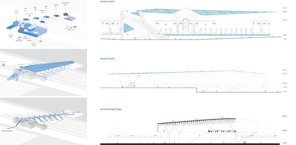 In our proposal, the station quite literally forms a bridge between the two halves. The bridge consciously passes the restrictions of the old station building en forms a new entry hall. The old building gets a new program and remains undisturbed. The plastered heritage is embraced by the light wood structure of the new hall forming an ensemble between old and new. There is a definitive break with the sensitive Soviet past, without forgetting or ignoring it.