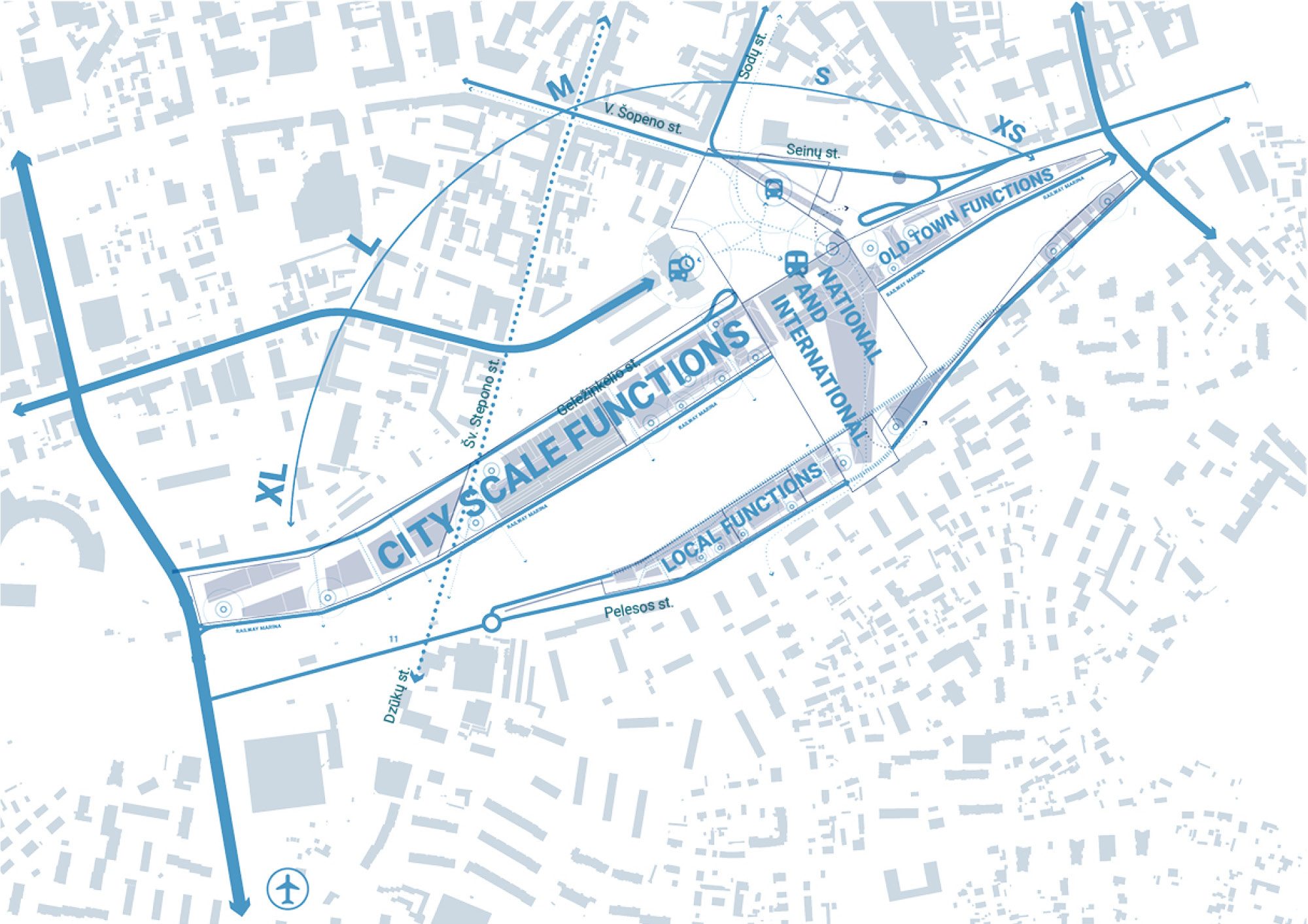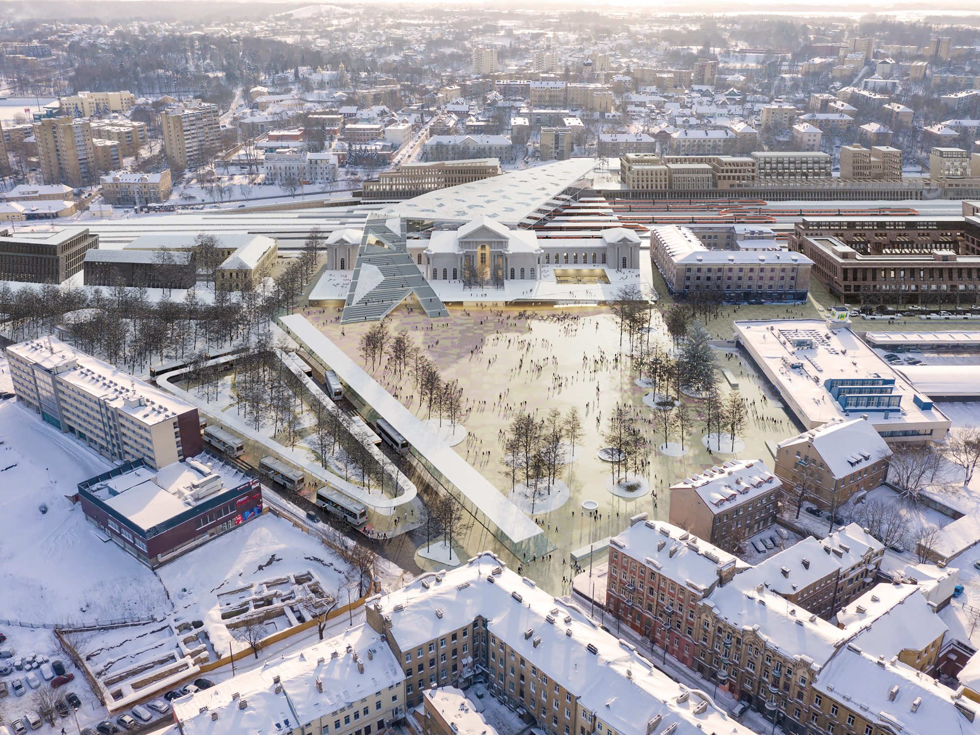 The competition by the Munincipality Vilnius and Lithuanian Railways was in search for a revitalisation of the stately station building from Soviet times. They did not only look for a way to make the different mobility streams function well together, but wanted the project to be a catalyst for the development of the surrounding urban fabric. How can the new station form a link between the two halves of the city that, partly due to the large height difference, have functioned seperately?