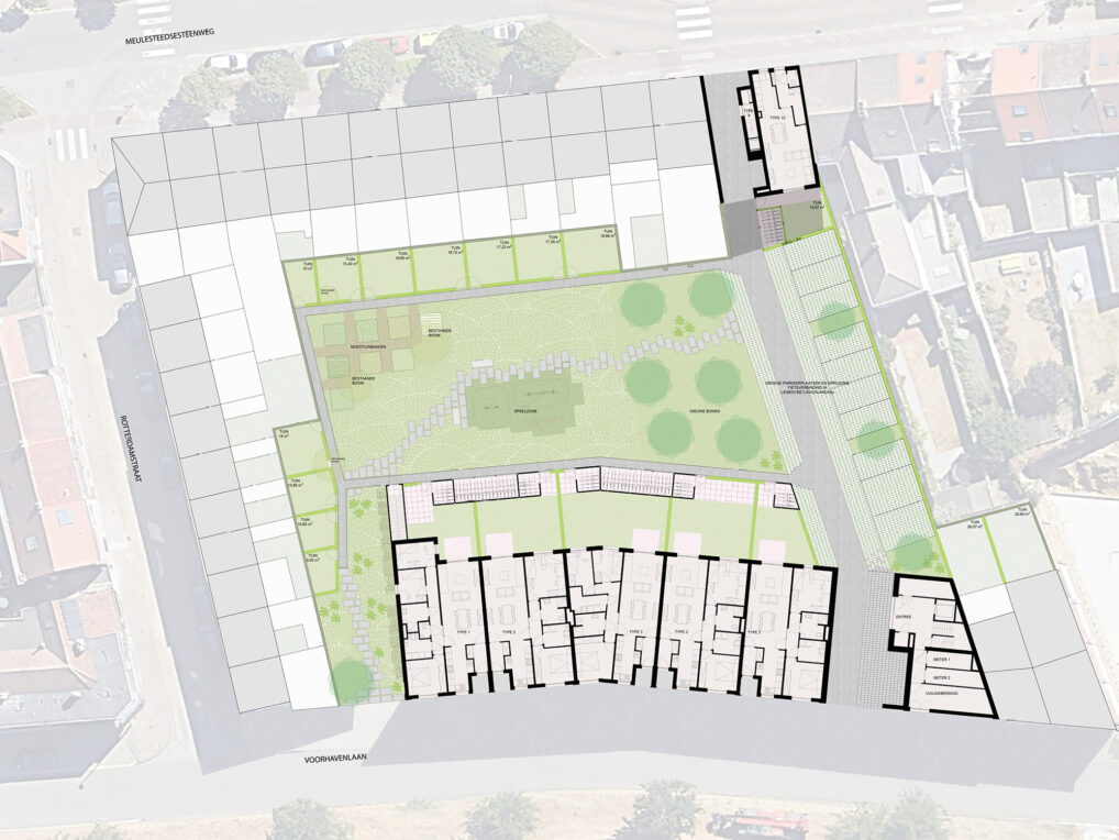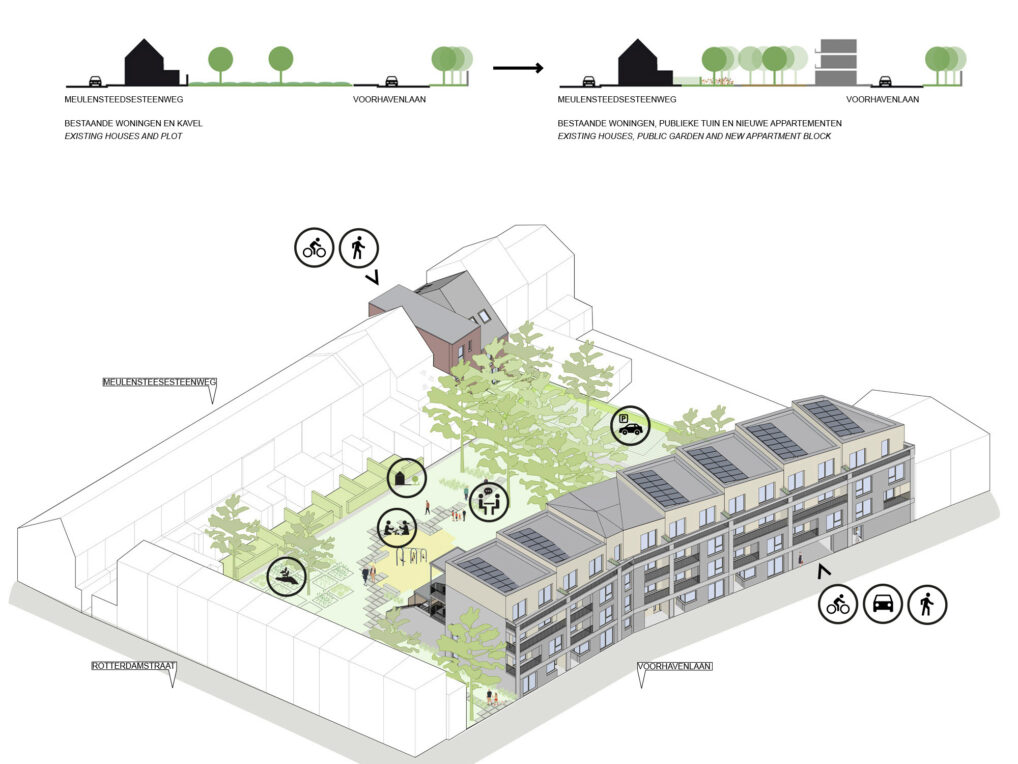 At the Meulesteedsesteenweg one of the existing terraced houses makes way for two new family homes. One of these two houses is being lifted so that a passage for pedestrians and cyclists arises to the Voorhavenlaan. This entrance also gives access to the collective garden. The path ends at the Voorhavenlaan where the car entrance is situated. Parking becomes organized around the connection between the two streets.